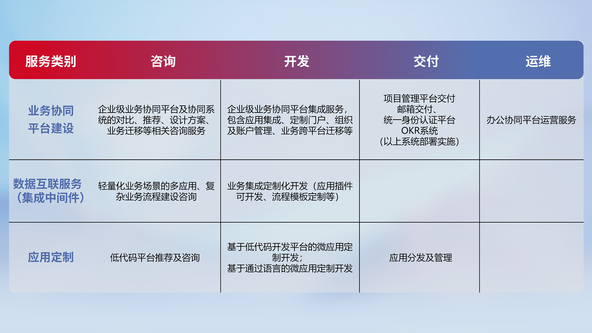 针对钉钉、、、、企微、、IDaas等平台级产品提供产品的规划、、、方案、、、、交付、、、、定制化开发等服务,,,实现如统一协同办公、、、智能客户服务、、、混合会议管理、、智能数据查询、、、、等业务场景,,,实现数字化转型。。。